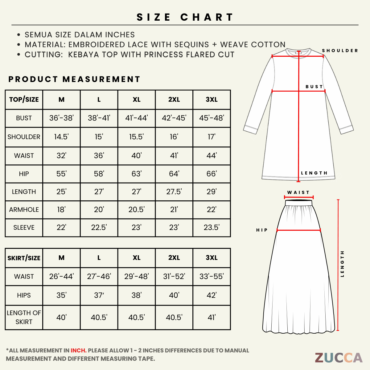- Kain (Skirt): Potongan duyung (mermaid cut) yang anggun dan menawan, mengekalkan kesopanan sambil menyerlahkan bentuk badan dengan elegan. Pinggang bergetah untuk keselesaan optimum dan padanan yang fleksibel. Fabrik lembut yang beralun cantik, menghasilkan pergerakan yang anggun dan elegan.