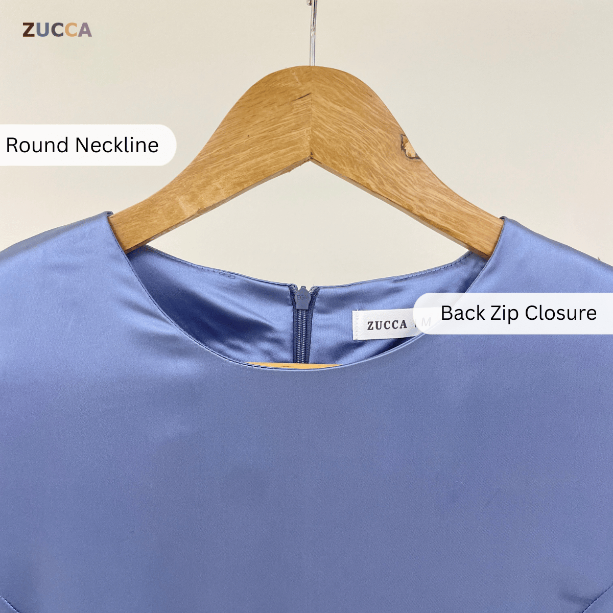 - Leher bulat dengan zip belakang tersembunyi