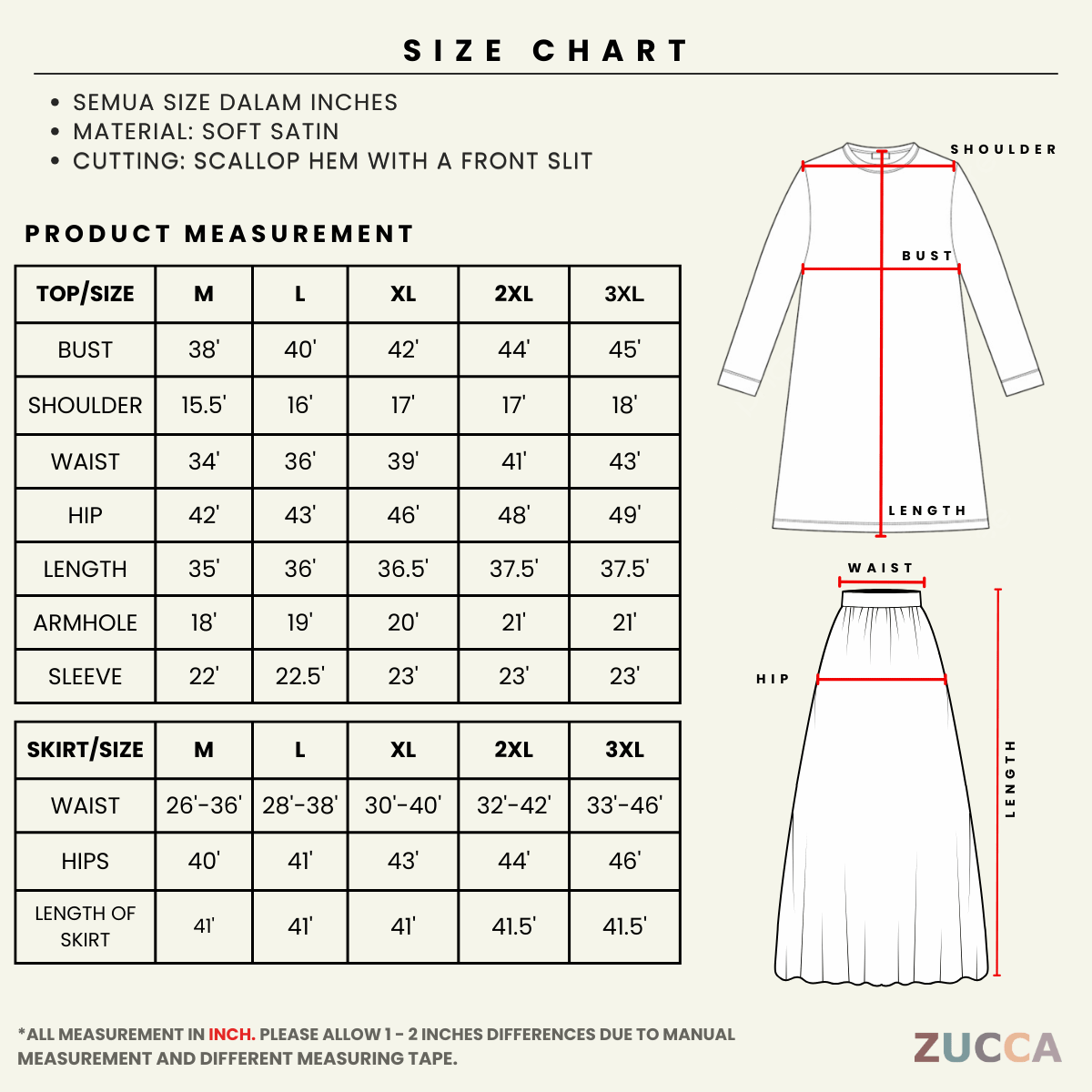Sila benarkan perbezaan sekitar 1–2 inci kerana pengukuran dibuat secara manual dan penggunaan pita ukur yang berbeza.