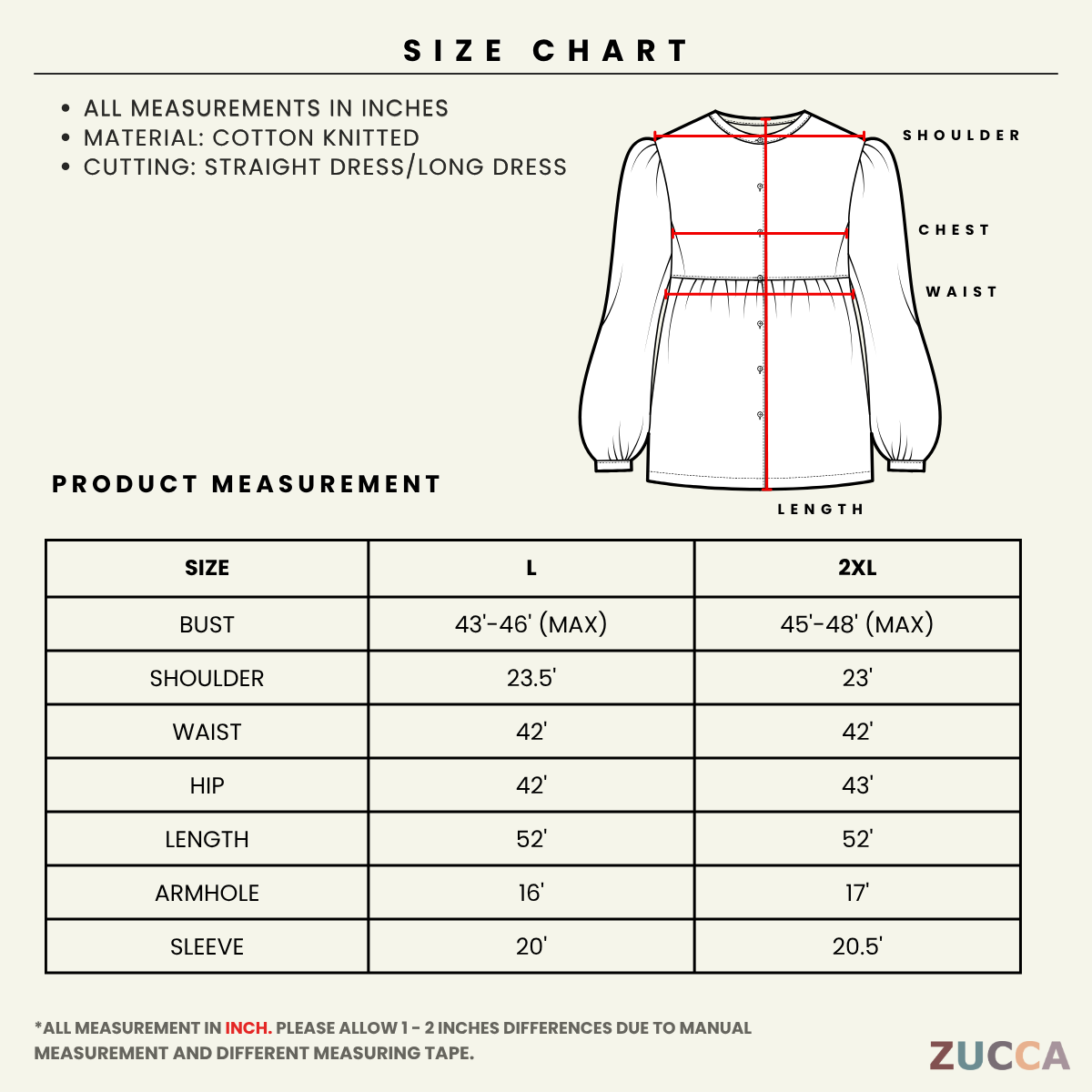 - PLEASE ALLOW 1 - 2 INCHES DIFFERENCES DUE TO MANUAL MEASUREMENT AND DIFFERENT MEASURING TAPE.