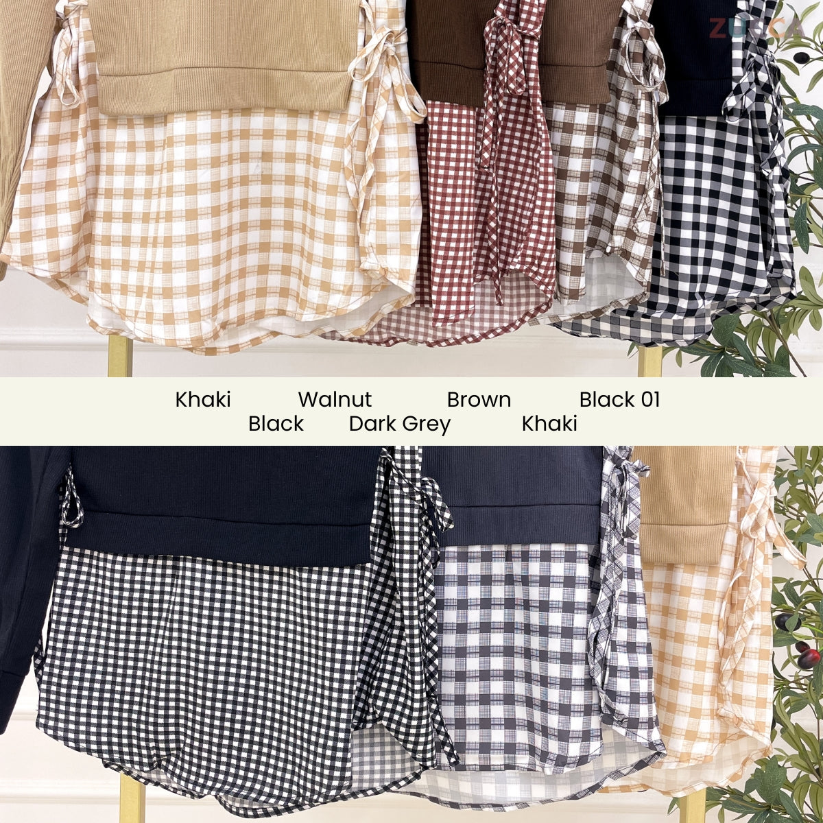 Butiran Rekaan: Kolar Leher Bulat (Round Neck Collar), Lengan Potongan Lurus (Straight Cut Sleeve), Reka Bentuk Layered dengan Corak Kotak-kotak (Checkered Layer Design), Ikatan Sisi (Side Tie Ribbon)