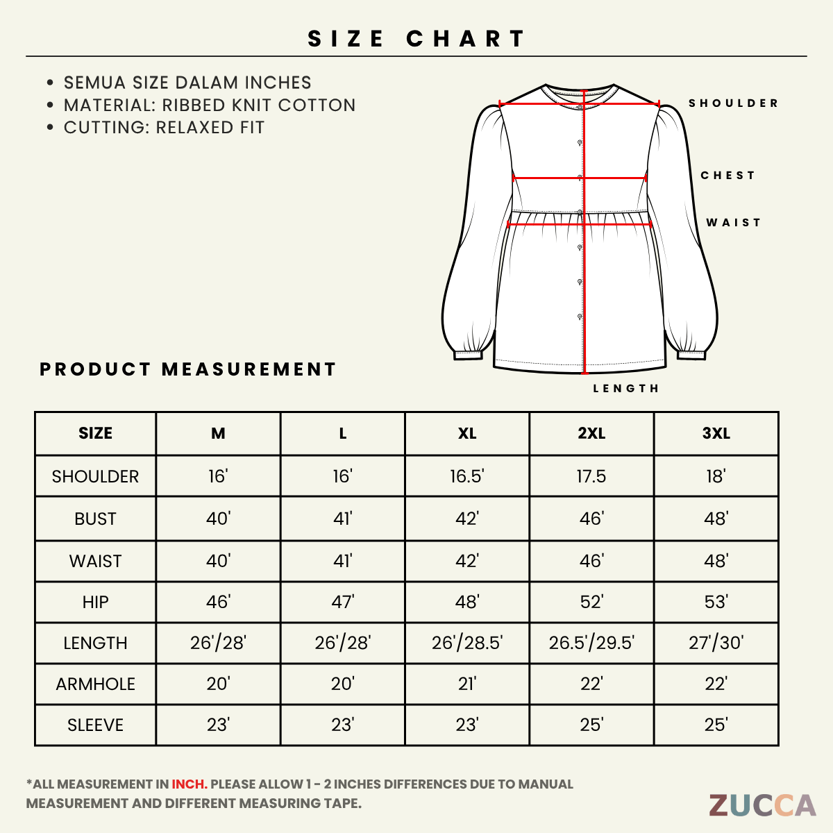• Please allow 1 - 2 inches differences due to manual measurement and different measuring tape.